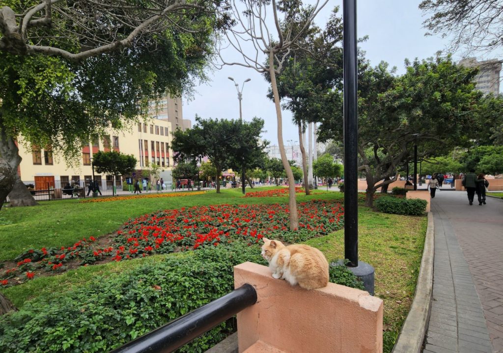 The first as Parque Kennedy, named for the US president John F. Kennedy due to the Alliance for Progress he oversaw in Latin America. Parque Kennedy is a beautiful green space in the middle of a busy city with dozens of cats. Our tour guide told us the cats were brought into the park originally to take care of a rat problem. However, no one expected how much the cats would multiply. Nowadays, they roam the park freely and are taken care of and fed. Some even let tourists pet them.
